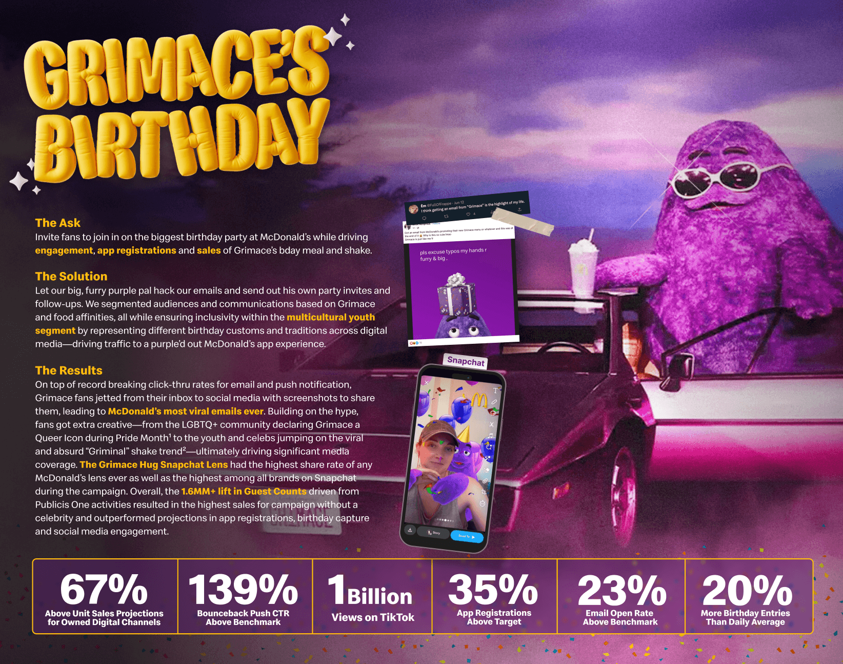From email to paid media, we united every channel to throw McD’s biggest birthday bash, cranking up engagement, app registrations, and sales of Grimace’s Birthday Meal and Shake. Outcomes: - 67% Above Unit Sales Projections - 139% Bounceback Push CTR - 1 Billion Views on TikTok Awards: - Effie Gold Award: Grimace Birthday - Adage Best Brand: Grimace Birthday